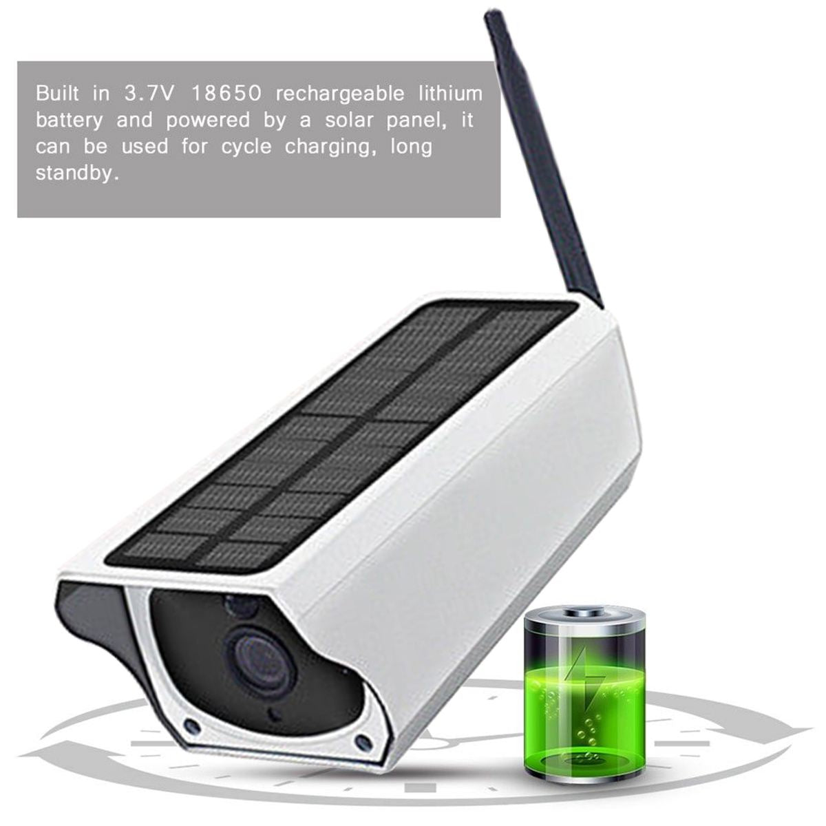 Two 18650 batteries need to be purchased by yourself. They can be bought at the local hardware store. Low power Solar Wifi Bullet Camera is the product that uses industry-leading low power solutions. It supports two way audio, PIR alarm, high resolution, night vision, control remotely. Features: - No Wire Needed: The latest development of surveillance technology: intelligence, easy installation and self-sufficiency. Put it anywhere around your property, no power supply needed. This intelligent system promotes property monitoring to a new level. Instant video and audio streams are accessed anytime and anywhere. - Solar Energy: A day's sunshine keeps the camera running for 5-6 days. This unparalleled performance is achieved by integrating batteries, solar panels and intelligent standby mode. - Monitoring battery power. 3.7V 18650 rechargeable lithium battery and powered by a solar panel, it can be used for cycle charging, long standby. Backup battery storage, monitoring without charging. It can be used when there is sunlight outdoors, and it can also use USB external charging. - Good Performance: Waterproof and moistureproof, it can get energy from the light to increase the battery life even in the rain day. Don't worry the bad weather outside the door. - Remote control. Users can also initiate monitoring outside, open the APP to view the cameras and monitor the pictures in real time. Infrared night vision. Built in high-quality array infrared light, 8 infrared lights, can see clearly in dark night. - TF card storage. TF cards can be inserted to store event snapshots and image. Maximum support for 64G storage card cyclic storage. - PIR detection. Users can choose to turn on/off the PIR detection alarm function, turn on the PIR detection function, when someone is found to intrude into the monitoring area, the camera will actively push the alarm information to the user's mobile phone. - Dis-net video. After the device is configured with home Wifi, if there is no network situation, the device PIR alarm function and video function can work normally. If there is no network, the APP won't be gotten messages from the camera. In no network environment, PIR alarm is triggered after the video can be connected to the network, video files can be found and play back, please refer to the video playback function introduction. - Low power prompt ADC automatically collects battery power data, when battery power is too low, it will push reminder charging information to the user's mobile phone. - The WIFI is connected with the built-in WIFI module, and the WIFI signal reception range is 50 m +. - 8 infrared lamps, the wavelength is 850nm, the effective distance is 10 meters. - Simple and easy to use. Intelligent online audio pair code, LAN search and two-dimensional code scan to add a variety of online mode. - User can add multiple cameras to realize multi-device monitoring, or a camera can be monitored simultaneously by multiple users. It can support up to 4 users to watch video online at the same time. Specifications: 1.Operating System: Linux 2.Pixels: 200W 3.Main Control Chip: T20-Z 4.Image Sensor: SC2235h 5.Audio Coding: G726, G711, AAC, MP3 format, 8K sampling rate, echo cancellation function. 6.Video Interface: OSD image superposition 7.Lens Type: all glass lenses 8.Lens Parameters: 3.6MM/F2.2 9.Visual angle: 105 degrees 10.Day and Nght Function: automatic switching of IR-CUT dual filters 11.Night Vision Distance: 8 meters 12.Network Protocols: P2P, TCP/IP, HTTP, TCP, UDP, SMTP, FTP, DHCP, DNS, DDNS, DNS. 13.Wired network: no support 14.Wireless Network: 2.4GHzIEEE 802.11b/g/n 15.Wireless Rate: 150Mbps (Max.) 16.Wireless Connection: smartlink Link distribution network 17.AcousticCode: support 18.AP Hot Link: support 19.P2P Connection: support 20.Onvif Protocol: no support 21.Resolution 1080P:1920*1080 22.Video Frame Rate: 25FPS, 15fps 23.Multimedia: support 24.PIR Detection: support 25.E-mail/FTP Alarm: no support 26.SD Card Video: support 27.Cloud Storage: support 28.UPnP: support 29.Storage: support TF card storage, max. support 64G 30.Size: 19.5*8*7cm/7.7*3.1*2.8in 31.Shell Material: Metal Package Included: 1 * Camera (Battery Not Included) 1 * Antenna 1 * User Manual 1 * Mounting Screw Kit |